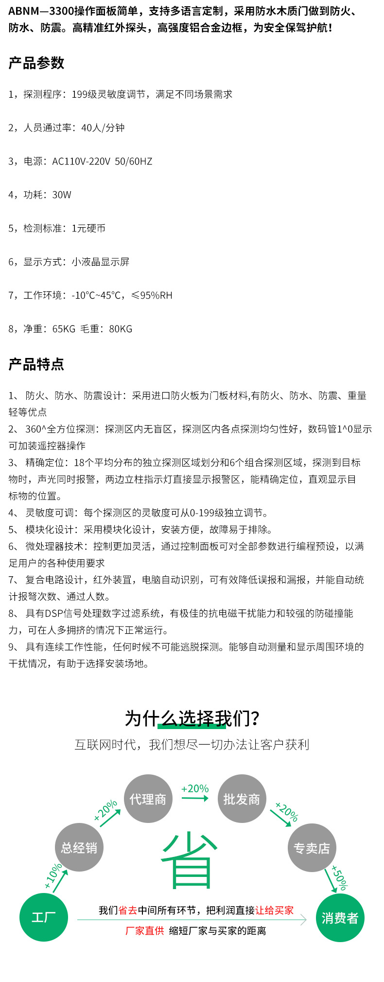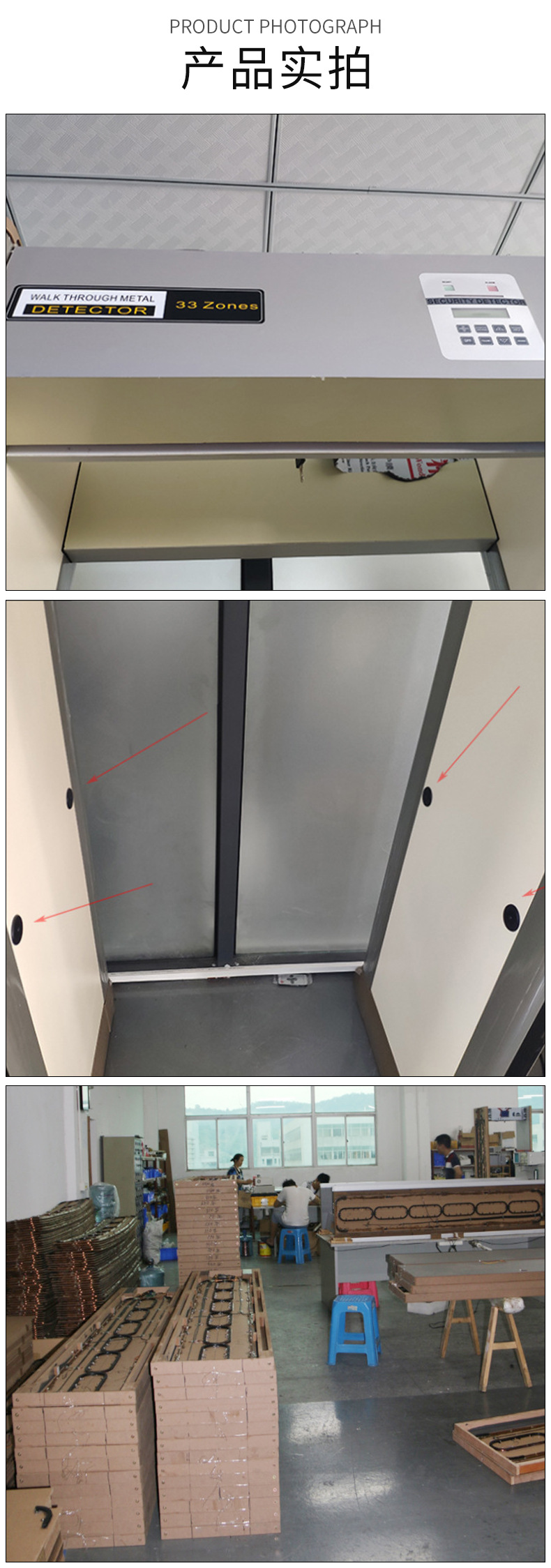 本款33区安检门操作简单,支持多国语言定制,采用防火木质门做到防火/防水/防震!金属检测功能灵敏,最小能够检测回形针,33个独立分区轻松识别金属准确位置,为安全保驾护航!